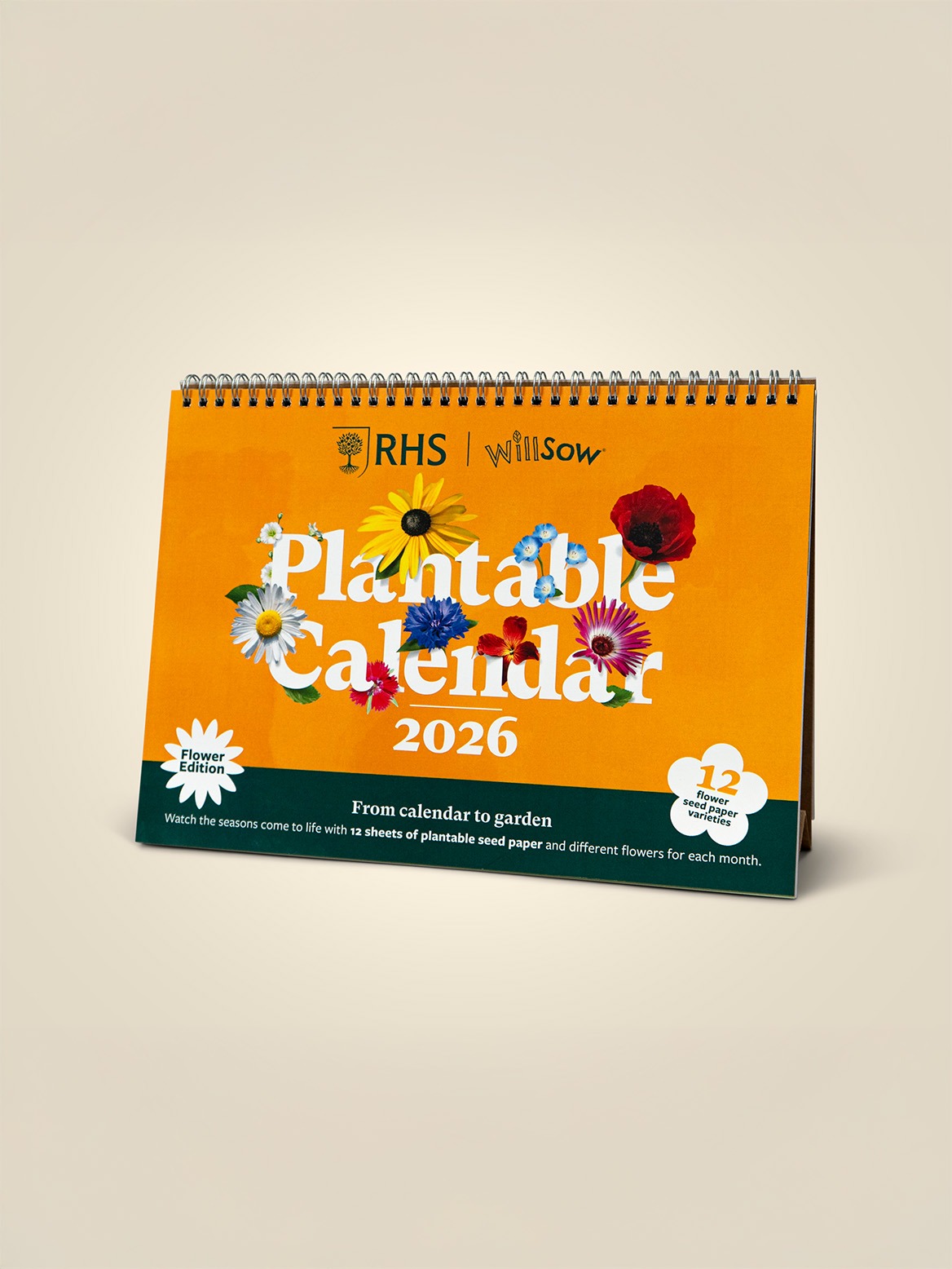 Designed in partnership with the Royal Horticultural Society (RHS), our A4 plantable desk calendar includes a seed paper insert for each month with different flowers to grow straight from the calendar to the garden!